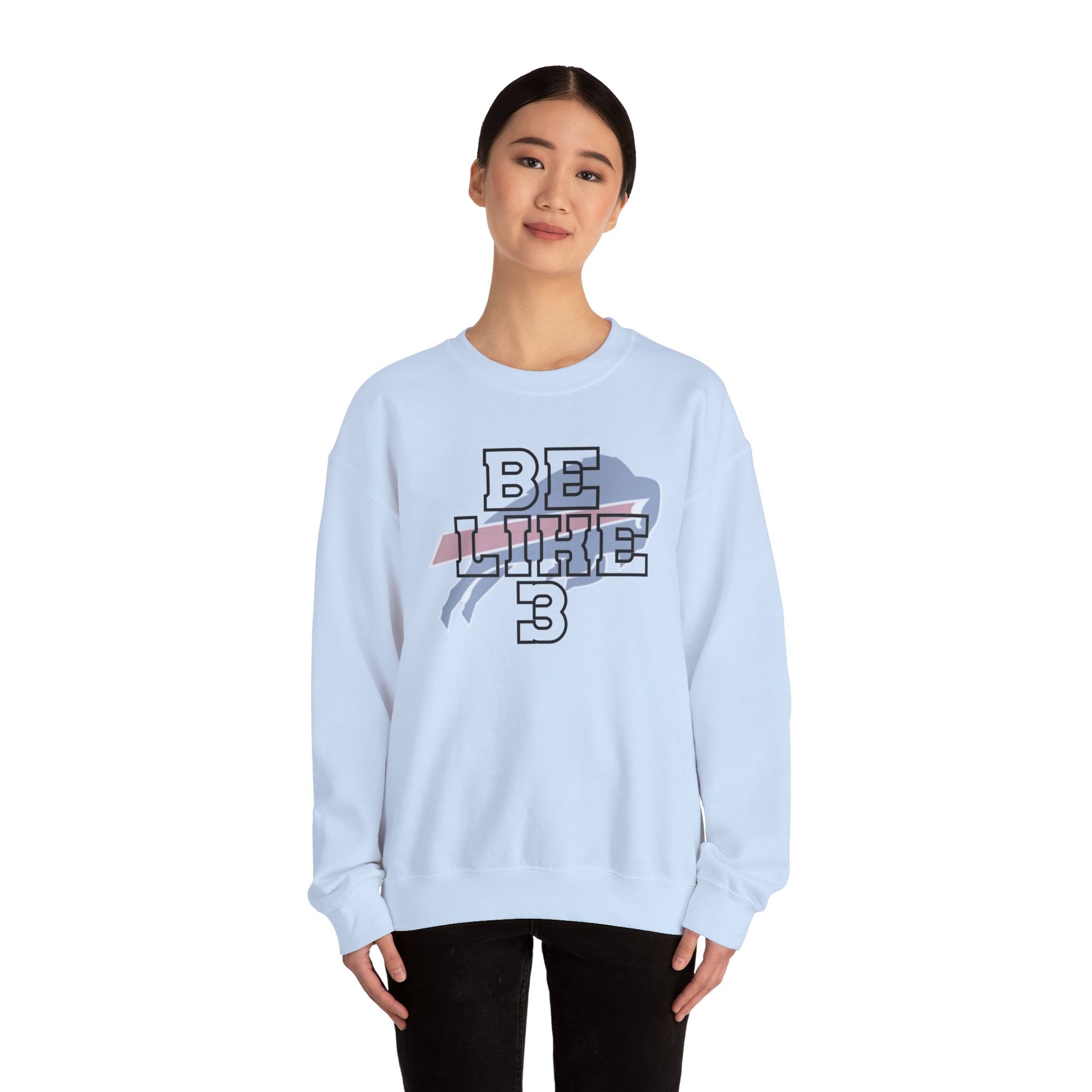 Find our Be Like #3 Damar Hamlin Black Outline Buffalo Bills Logo on a unisex heavy blend crewneck sweatshirt that is pure comfort. These garments are made from polyester and cotton. This combination helps designs come out looking fresh and beautiful. The collar is ribbed knit, so it retains its shape even after washing. There are no itchy side seams on these sweaters. Go Bills!
