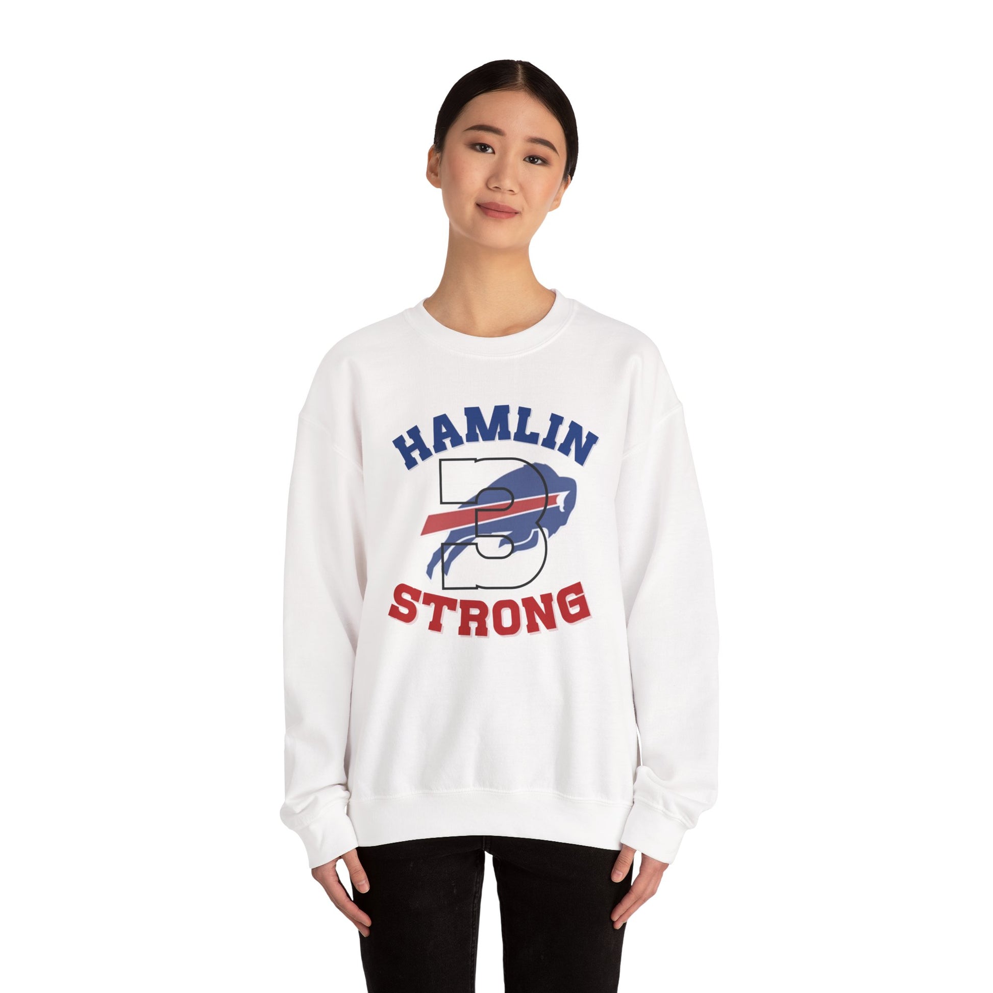 Find our Hamlin Strong #3 Damar Hamlin Buffalo Bills Logo on a unisex heavy blend crewneck sweatshirt that is pure comfort. These garments are made from polyester and cotton. This combination helps designs come out looking fresh and beautiful. The collar is ribbed knit, so it retains its shape even after washing. There are no itchy side seams on these sweaters. Go Bills!