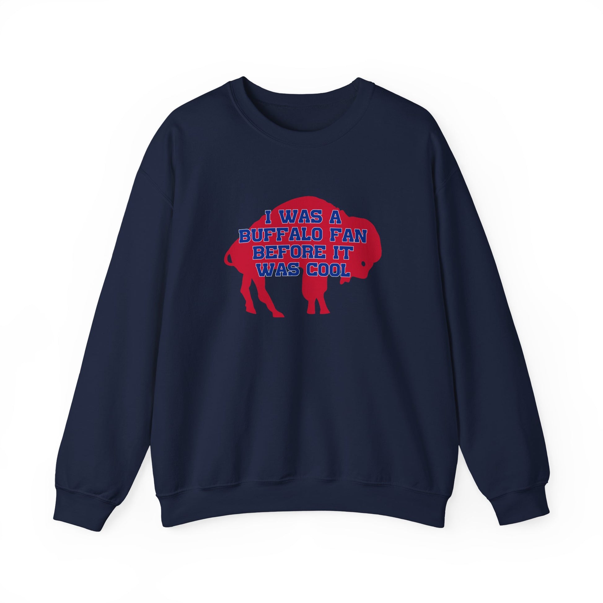 Find our I Was a Buffalo Fan Before it was Cool Retro Red Logo Bills Mafia Football design on a unisex heavy blend crewneck sweatshirt that is pure comfort. These garments are made from polyester and cotton. This combination helps designs come out looking fresh and beautiful. The collar is ribbed knit, so it retains its shape even after washing. There are no itchy side seams on these sweaters. Go Bills!