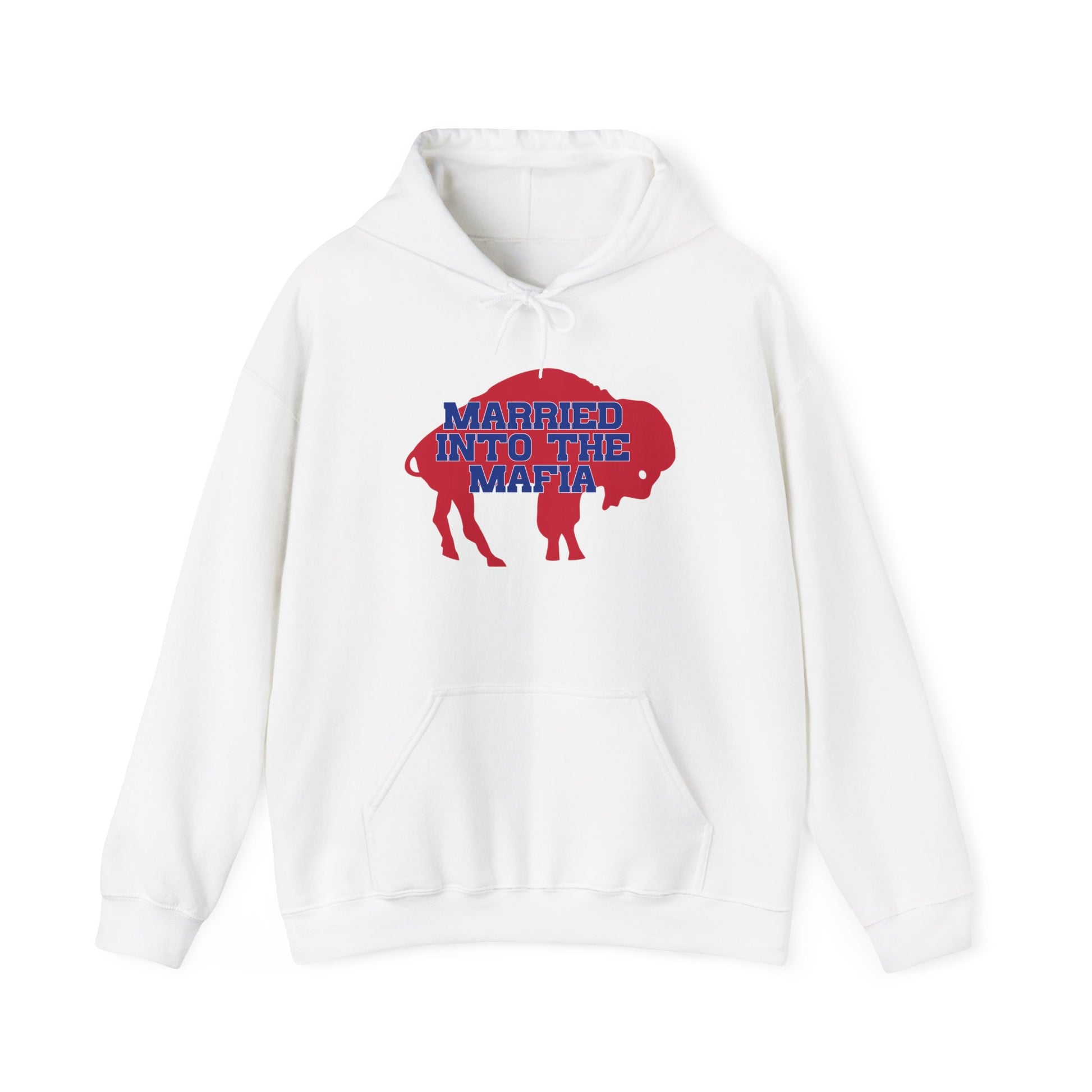 Find our Married Into the Mafia Buffalo Bills Football Bills Mafia design on a unisex heavy blend hooded sweatshirt. Made with a thick blend of cotton and polyester, it feels plush, soft and warm, a perfect choice for any cold day. In the front, the spacious kangaroo pocket adds daily practicality while the hood's drawstring is the same color as the base sweater for extra style points. Go Bills.