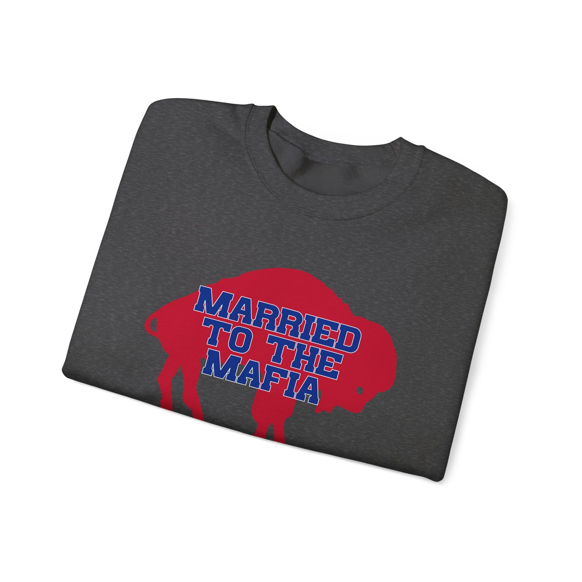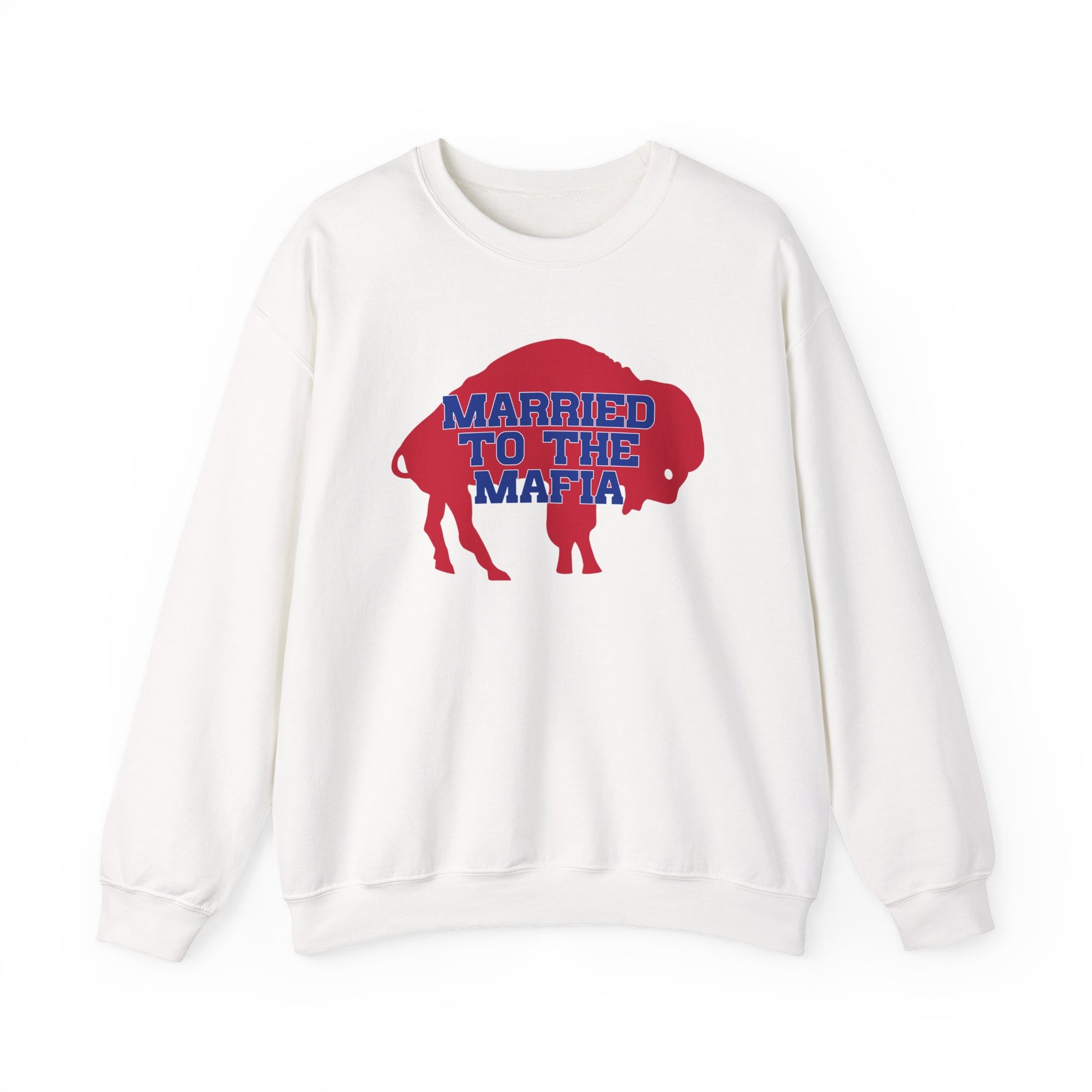 Find our Married to the Mafia Buffalo Bills Football design on a unisex heavy blend crewneck sweatshirt that is pure comfort. These garments are made from polyester and cotton. This combination helps designs come out looking fresh and beautiful. The collar is ribbed knit, so it retains its shape even after washing. There are no itchy side seams on these sweaters. Go Bills!